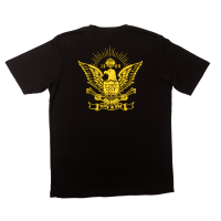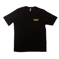 Ernie Ball In Slinky We Trust screen printed on the back of a black poly cotton jersey t-shirt with the Ernie Ball logo on the chest. 65% polyester, 35% combed ring-spun cotton, 3.5oz fabric.