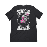 Cheat Death with this ripping Slinky graphic! Featuring our classic Ernie Ball stack logo on the left chest with a full shred fest on the back. Screen printed white/pink ink on black poly cotton jersey t-shirt. 65% polyester, 35% combed ring-spun cotton, 3.5oz fabric.